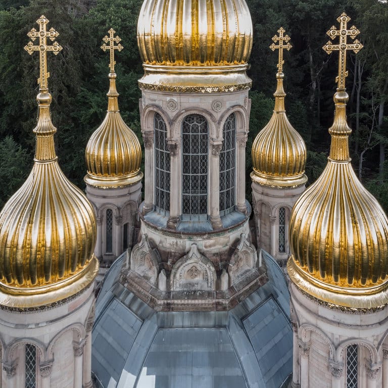 Ölvergoldung der Zwiebelkuppeln und orthodoxen Kreuze